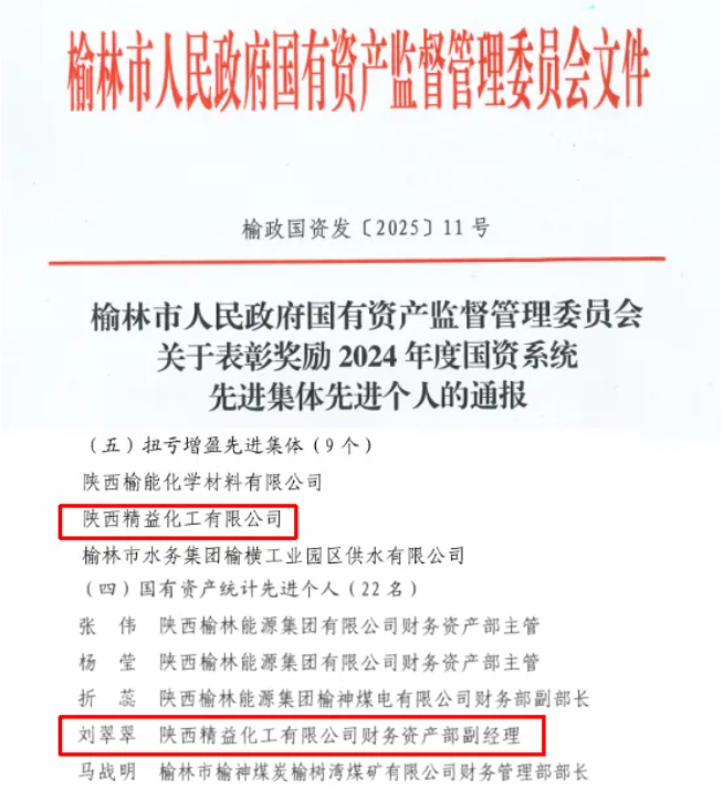 近日,榆林市国资委下发表彰奖励文件,公司被授予2024年度国资系统“扭亏增盈先进集体”荣誉称号,公司财务资产部副经理刘翠翠被评为2024年度国资系统“国有资产统计先进个人”,标志着公司在扭亏增盈、提质增效工作领域迈出坚实步伐。一年来,在市国资委和集团公司的坚强领导下...